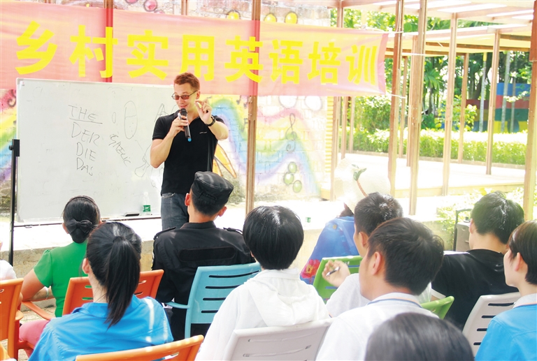 像蒲秋仕这样的零基础学员不在少数。一开始,学员们怕被“看笑话”,不敢开口说英语。“三亚的美食有哪些呢?”来自奥地利的“洋老师”史蒂夫教学经验丰富,他从村民熟悉的话题切入,设计击鼓传花等小游戏,引导村民参与课堂问答互动。
