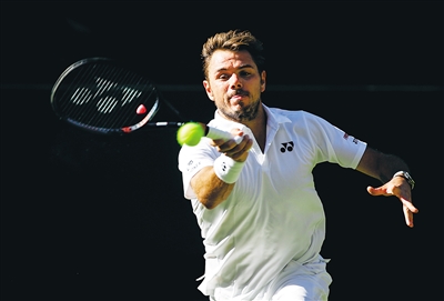 在温网男单第一轮比赛中,瑞士选手瓦林卡以3:1战胜保加利亚选手迪米特洛夫晋级下轮。 新华社发(唐诗摄)