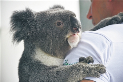 7月3日,在澳大利亚悉尼,悉尼野生动物园工作人员查德·斯泰普尔斯抱着四岁的考拉“阿彻”参加新闻发布会。
