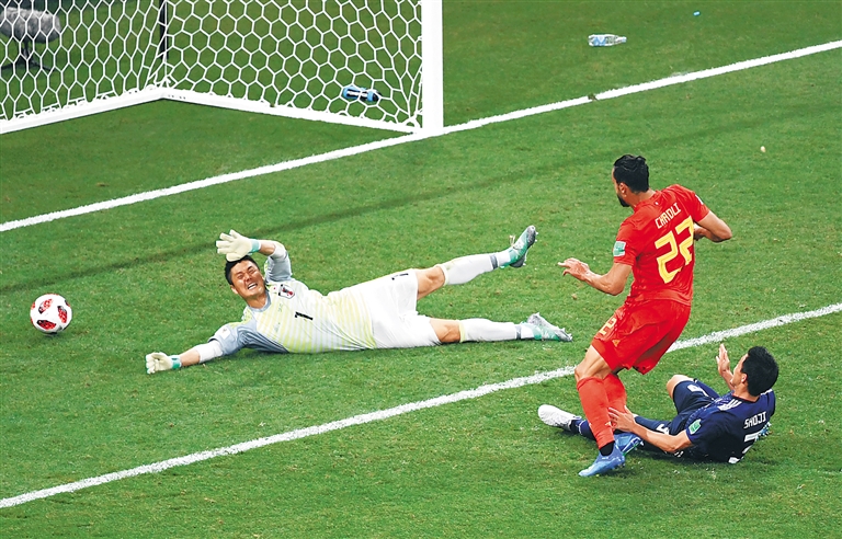 北京时间7月3日凌晨,在顿河畔罗斯托夫进行的俄罗斯世界杯八分之一决赛中,比利时队在0:2落后的情况下,以3:2逆转日本队,晋级八强。图为比利时队球员沙德利(中)终场哨响前破门,绝杀日本队。