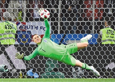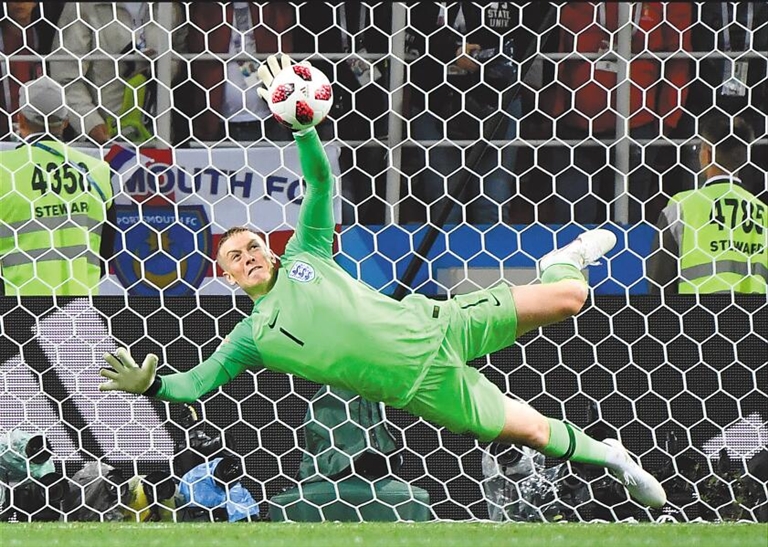英格兰守门员皮克福德在点球大战中扑出点球。新华社发