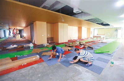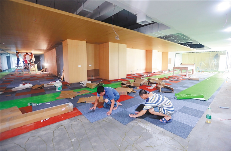 7月5日,在海口复兴城国际离岸创新大厦项目现场,工人正在进行内部装修。 本报记者 张杰 通讯员 张余雪 摄