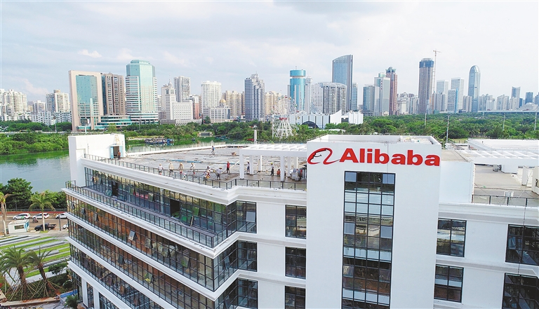 7月5日,海口复兴城国际离岸创新大厦项目已经露出“真容”,顶楼外立面上的阿里巴巴形象标识引人注目。阿里巴巴集团、蚂蚁金服集团将率先入驻海口互联网总部经济区,建设面向21世纪海上丝绸之路的区域总部。本报记者 张杰 通讯员 张余雪 摄