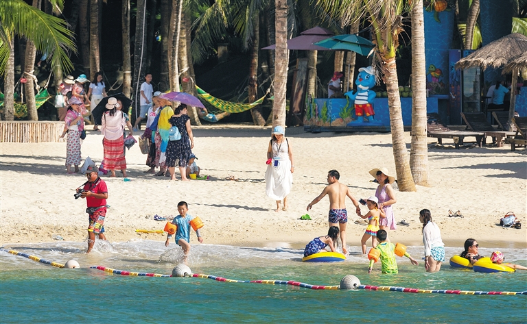 7月5日,陵水分界洲岛旅游区,游客在海滩游玩。