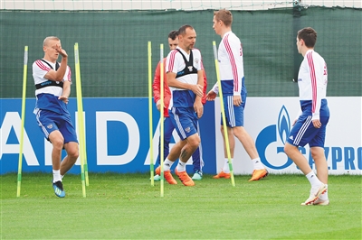 7月6日,俄罗斯队在位于莫斯科的训练基地训练,备战世界杯四分之一决赛与克罗地亚队的比赛。图为俄罗斯队球员在训练中。新华社发