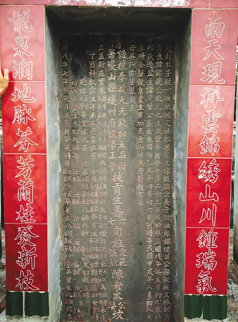在陈锡熙故居中,存放着一块石碑多年无人问津。擦拭蒙尘,可以看出,这碑主人为陈锡熙祖父陈儒英的堂兄弟——陈德参,但在其左侧却发现有广东“四大状师”之一的何又雄的落款:“高要县教谕,愚弟何又雄顿首拜撰。”