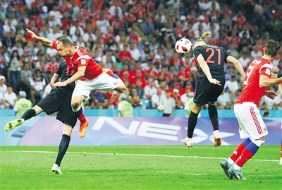 北京时间7月8日凌晨,在索契进行的俄罗斯世界杯足球赛四分之一决赛中,克罗地亚队与俄罗斯队在120分钟内战成2:2平。经过点球大战,克罗地亚队以总比分6:5战胜俄罗斯队,晋级四强。图为克罗地亚队球员维达(右二)头球破门。 新华社发