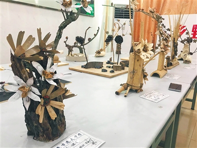 干枯的落叶、皴裂的树干、开心果壳和松子壳、晒干后的玉米叶和玉米须……很多人眼里这些“毫无用处的垃圾”,在三亚市逸夫中学学生手中却能变成一件件手工作品。