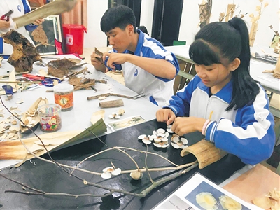“‘乡野拾趣’工作坊每周只有一节课,很多感到意犹未尽的同学,放学后会三五成群地到工作坊‘加班’。” 王艳娜说,许多同学在生活中一旦发现能制作手工素材的材料,就会收集起来放到工作坊里。