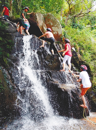 在保亭黎族苗族自治县,呀诺达热带雨林景区有一个夏日凉爽项目——“踏瀑戏水”。换上景区特制的草鞋和头盔,乘着大巴车盘旋十多分钟,到达景区的半山腰,“踏瀑戏水”拓展活动就设置在呀诺达雨林纵深1.2公里、落差200米的梦幻谷中,急流、怪石、瀑布、巨树等构成了一个令人热血沸腾、几欲征服的神秘地带。手里拽着缆绳,脚下蹬着被瀑布冲击得已经圆滑的石头沿溯而上,在穿越激流险滩、深潭飞瀑的同时,还能欣赏到梦幻谷的热带雨林美景,可谓是乐趣颇多的一种体验。