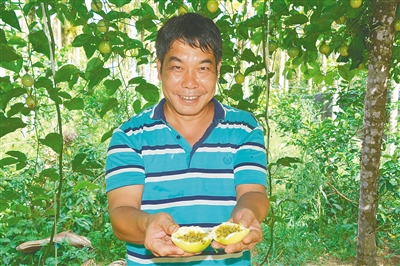 “以槟榔树杆代替水泥桩,搭棚种植百香果,不仅能保护生态、盘活林下土地,每亩地还能节约4000元左右的成本。”枫顺种养专业合作社负责人赵东辉介绍,黄金百香果喜湿润,当地连片的槟榔林能为其提供适宜的遮阴度和湿润度,且当地土壤肥沃富硒,种植出的百香果品相好、品质高。
