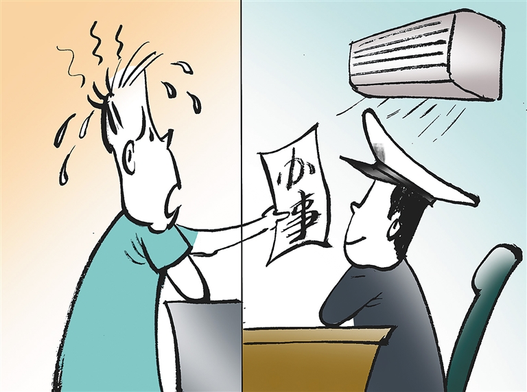 炎炎夏日,一块玻璃之隔,冷热有别,工作人员吹着空调,办事人员却备受煎熬,请问,百姓至上的理念哪去了?为民服务,不忧百姓之所忧,不设身处地为群众着想,而是自己怎么方便怎么来,试问这样的服务态度又如何能服务好百姓?稍感欣慰的是,该交警大队已经及时整改。只是整改问题时,别忘了顺带把服务观念整改好。这正是: