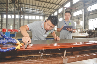 7月11日,位于海口狮子岭工业园区的海南昆仑新材料科技股份有限公司,技术人员正在检验木塑地板的质量。