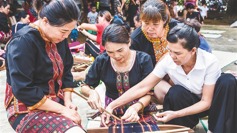 7月10日上午,昌江黎族自治县石碌镇山竹沟村村民陆永成院子里,75名来自不同村庄的黎族妇女集中参加黎锦技艺培训。
