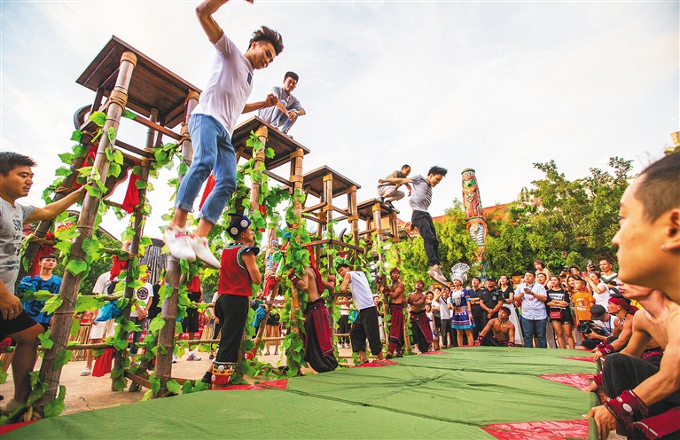 图为6月11日,百余名学生游客体验三亚千古情景区举行的民族特色成人仪式。本报记者 武威 摄