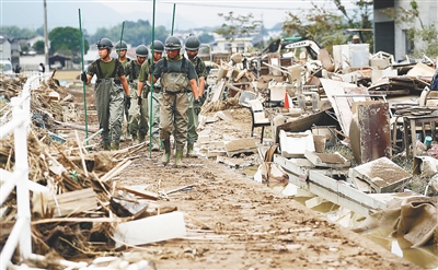 7月12日,在日本冈山县仓敷市,士兵开展搜救。