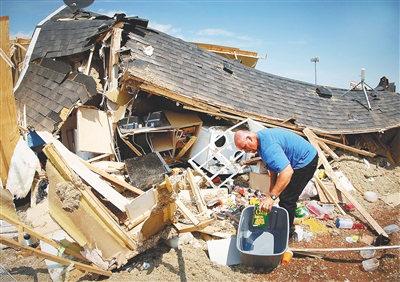 7月10日,在美国北达科他州沃特福德,一名男子在被龙卷风损坏的建筑中寻找有用的物品。