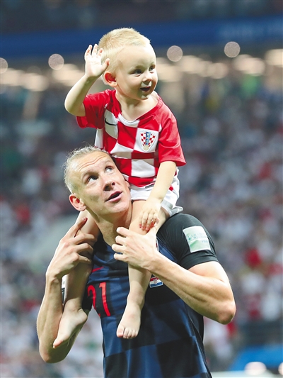 7月11日,克罗地亚队球员维达赛后与孩子庆祝。 新华社发