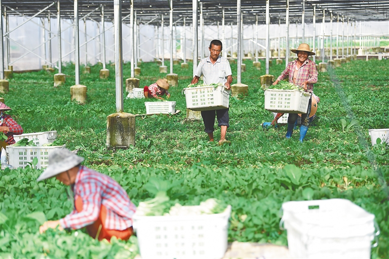 今天上午,记者来到位于海口市琼山区三门坡镇的菜篮子大荒洋蔬菜基地。在大棚内,绿油油的菜地里种满了上海青、小芥菜等蔬菜,工人们忙着收菜装箱。