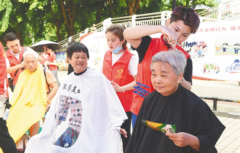 7月13日上午,海口市美兰区志愿者在明珠广场为市民义务剪发。当天,海口市文明办、美兰区文明办联合举办“告别不文明行为 做文明有礼海口人”系列宣传活动暨志愿服务集市活动,志愿者现场开展义剪、文明旅游倡议、急救技能展示、心理咨询服务等活动。本报记者 邓海宁/文 本报记者 张茂 通讯员 王聘钊/图