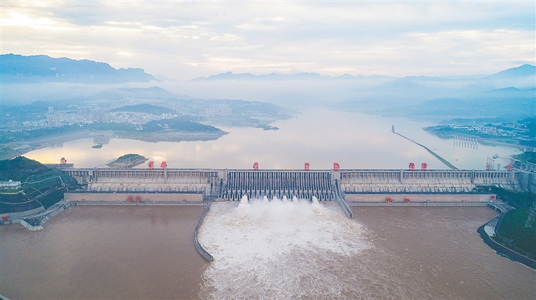 7月13日,三峡大坝开启泄洪深孔下泄上游来水,腾出库容。