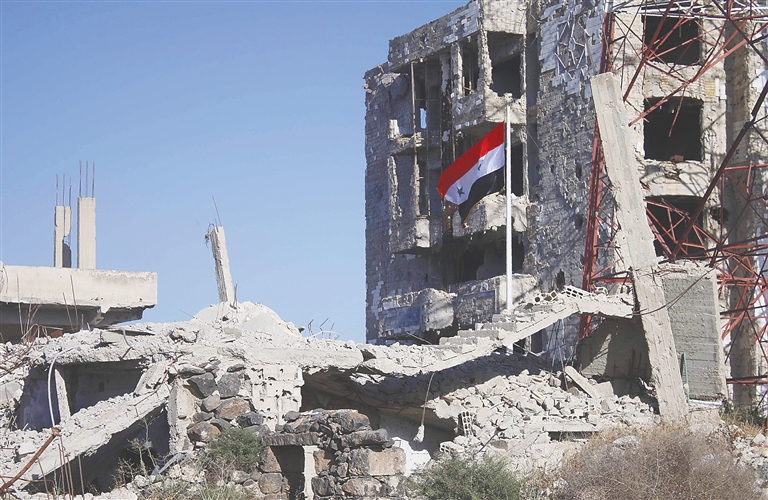 7月12日,在叙利亚德拉市拜莱德区,一面叙利亚国旗插在废墟中。