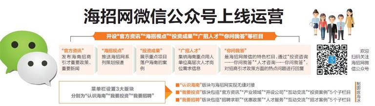 海招网微信公众号立足打造海南“互联网+招商+引才”平台,聚焦投资者、高端人才的关注点,为引进国内外500强和行业龙头企业、海内外人才来琼创业就业提供服务。海内外投资者以及人才可通过海招网微信公众号,第一时间获取海南招商引才的最新资讯,更加便捷地进行咨询互动。