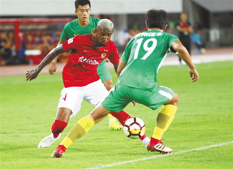 7月18日,在2018赛季中超联赛第12轮比赛中,广州恒大淘宝队主场以4:0战胜贵州恒丰队。图为广州恒大淘宝队球员塔利斯卡(前左)在比赛中争抢。 新华社记者 黄国保 摄