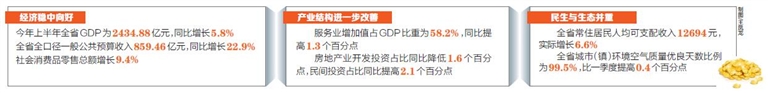 上半年我省经济稳中向好,还体现在:零售市场活跃度持续,社会消费品零售总额增长9.4%;市场供需总体稳定,物价小幅回落,居民消费价格(CPI)上涨2.7%,较一季度回落0.4个百分点;出口总额跌幅缩窄,上半年降幅比一季度缩窄22.2个百分点;其中加工贸易出口年内持续保持高增长,累计出口值36.8亿元,增长58.1%。
