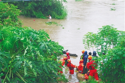 9时41分,消防官兵赶到现场发现,高架桥下有1名男子被困河中,男子紧紧抓住身旁的竹子,神情慌张。由于河面较宽,水流湍急,暗流涌动,且漂浮物较多,加上水已没过该男子胸部,如果不及时救出该男子,随着河水上涨将面临更大的危险。消防官兵现场制作救援工具,把救生衣、救生圈捆绑在安全绳上,通过手抛的方式将救生物品送到被困男子手中,再把该男子拉回岸边。经过官兵近20分钟的紧张救援,该男子被成功救出。