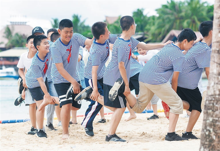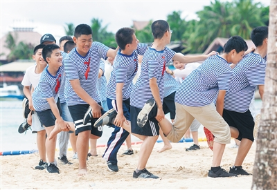 近日,陵水黎族自治县分界洲岛旅游区,一个学生旅游团的游客正在海滩上做游戏。进入暑假,随着“学生团”增多,我省各景区开始出现旅游小高峰。本报记者 武威 通讯员 童国强 摄