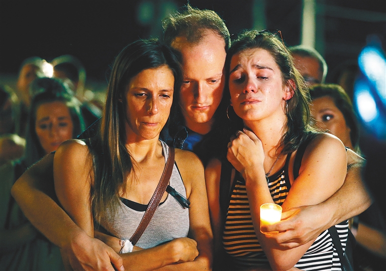 7月20日,在美国密苏里州布兰森市,人们在为事故遇难者举行的烛光守夜活动上相互慰藉。