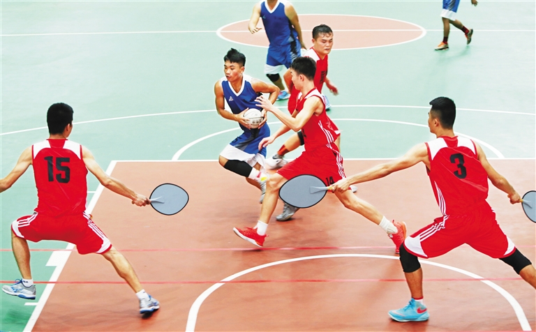 7月22日,省第六届少数民族运动会珍珠球赛在昌江开赛。图为昌江男队与陵水男队在比赛中。本报记者 苏晓杰摄