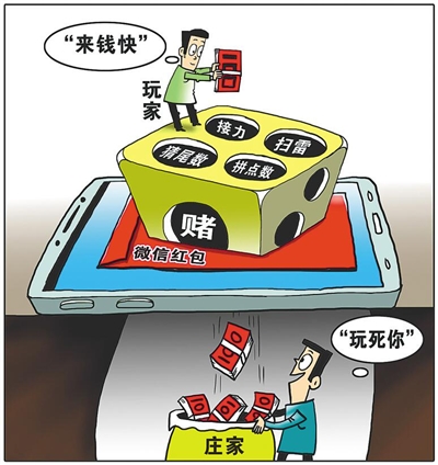 记者调查发现,2015年至今,微信红包赌博手法不断翻新,从最初的“接力”类,即抢到最小红包者输,继续发红包;到“扫雷”类,即抢到特定尾数者输;再到“猜尾数”,即猜错尾数者输;直至现在的“拼点数”,即点数小者输……花样越来越多,金额越来越大。