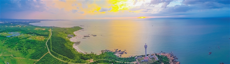 在木兰湾西南角,矗立着一座航标灯塔。从灯塔的位置远眺,浩瀚的南海碧波荡漾,虎威岭、七星岭遥遥相对。近看,成片的树林郁郁葱葱,如同一幅美丽的画卷。本报记者 袁琛 摄