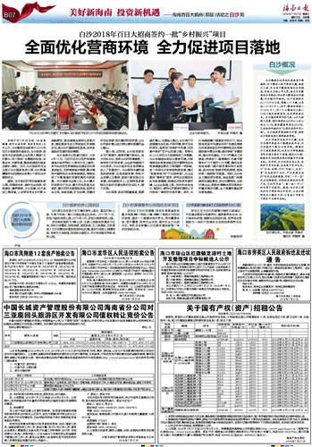 海南日报 美好新海南投资新机遇——海南百日大招商(项目)活动之白沙篇 015 2018-07-271 2018年07月27日 星期五