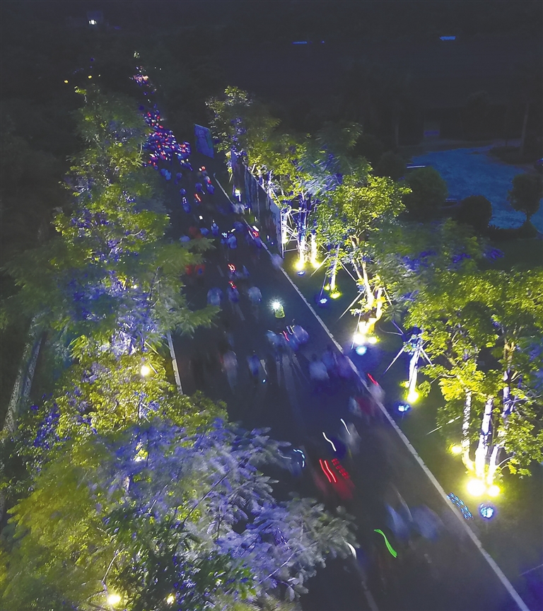 7月28日,人们在暮色中头戴荧光灯在琼海田园慢跑。当天是周末,2018琼海市嘉积镇荷花节在龙寿洋田野公园开幕,田野荧光跑、灯光展、荷香之夜等活动吸引了众多市民和游人参与。特约记者 蒙钟德 摄