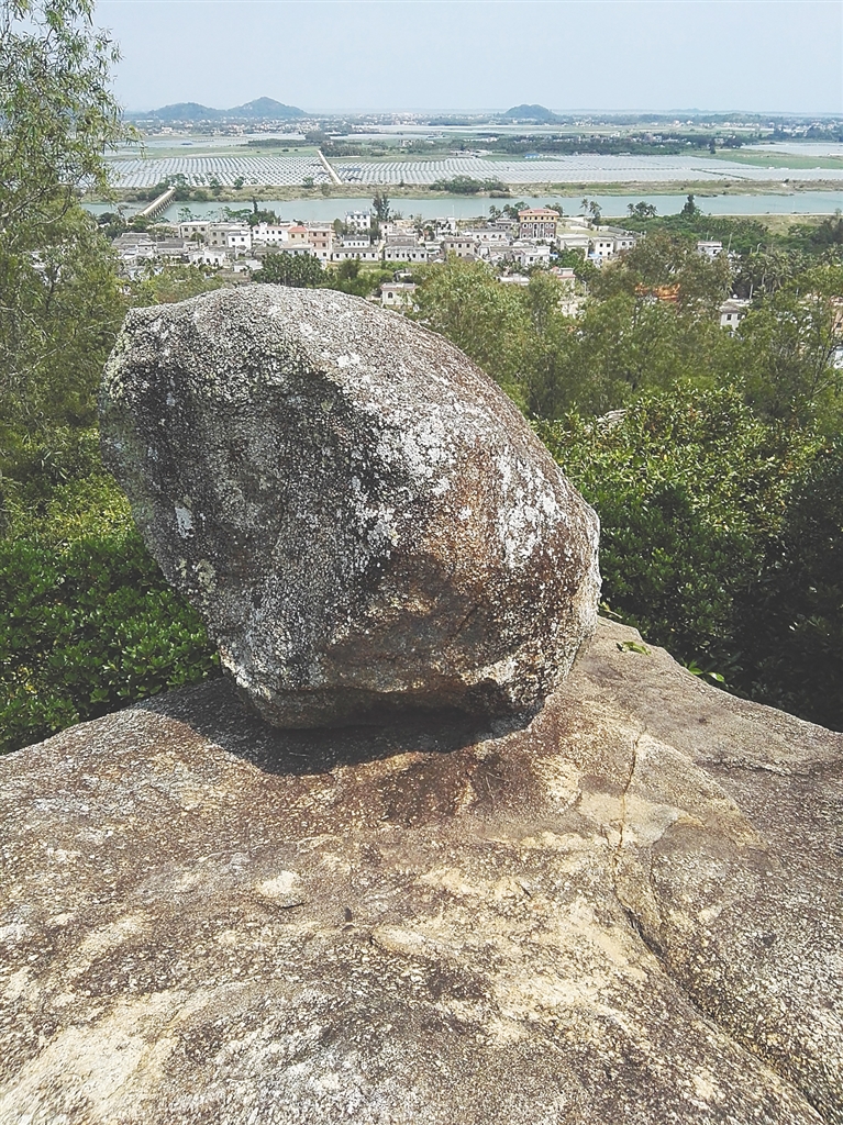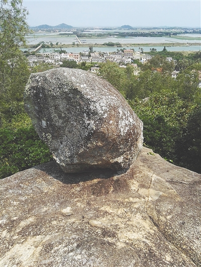 过了山顶,下去便是普光岩。普光岩上竖立着一块飞来石,似从天外飞来。普光岩也是小南山上观光的绝佳之地,从普光岩上俯瞰水沟村,成片的百年古屋,绿油油的农田,漫山遍野的桉树、榕树、海棠树……还有远方巍然屹立的东山岭,勾勒出一幅精妙绝伦的水墨画卷。