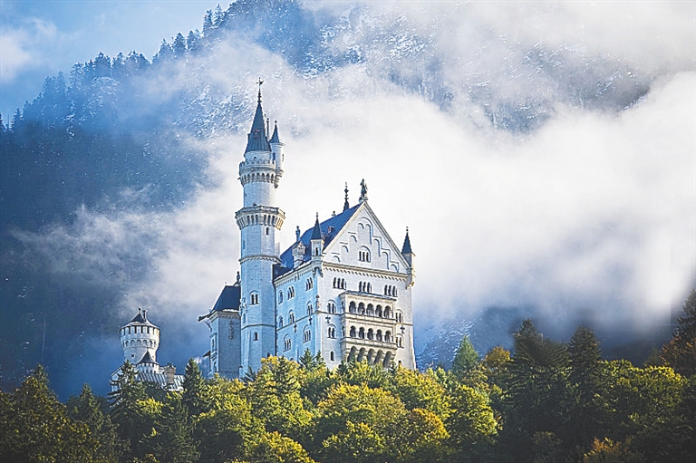 小城福森位于阿尔卑斯山脚下,是罗曼蒂克大道的终点,这是一个只有一万六千人的小镇,但到新天鹅堡旅游的游客都要经过此地。小镇安详宁静,周日上午教堂的钟声敲响,小镇居民们都会涌向教堂去做礼拜,这时才会显得热闹一点。小镇外有一个湖泊叫佛根湖,湖面辽阔,平静如镜,傍晚时分仍有不少男女在湖中畅游。新天鹅堡是人们都知道的,它是巴伐利亚国王路德维希二世在位时建造的童话宫殿,全部用灰白色花岗岩建造,高高耸立在波拉特峡谷的一处峭壁脊上。新天鹅堡造型奇特,由好几个尖尖的塔楼组成,像展翅欲飞的天鹅,故名天鹅堡,加之山脚有一座路德维希二世的父亲老国王马克西米利安二世建造的哥特式城堡,所以人们就把山顶的城堡叫作新天鹅堡。新天鹅堡奇特的造型是现代迪斯尼乐园创始人所模仿的造型,所以世界各地的迪斯尼乐园里都会有一座仿造新天鹅的塔楼型建筑,以此吸引孩子们好奇的目光。