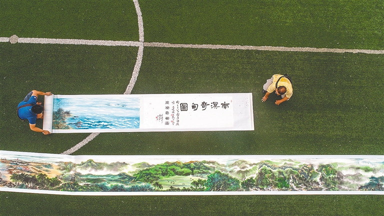 这幅恢宏壮观的画卷由祖籍南京、目前长期定居海南的七旬国家一级美术师何牛耗时3年绘制而成。画作中融入了他对海南的所思所想所感。由于规模宏大,摄影师要运用航拍设备,才能完整拍下整幅画卷的全貌。