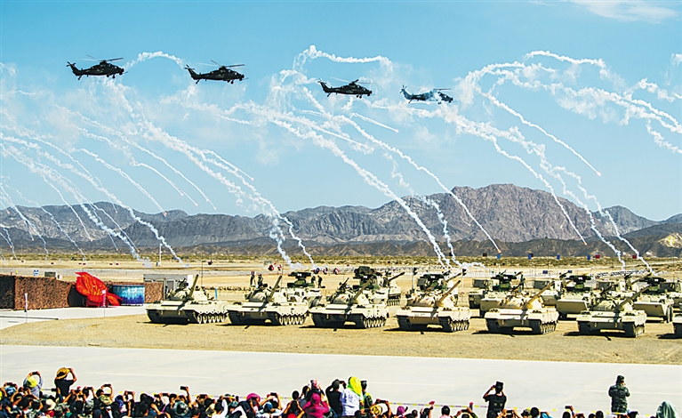 7月29日,在新疆库尔勒赛区开幕式上,四架武直-10直升机通过观礼台。当日,“国际军事比赛-2018”中国承办赛事开幕式分别在新疆库尔勒市和福建泉州市举行。 新华社发