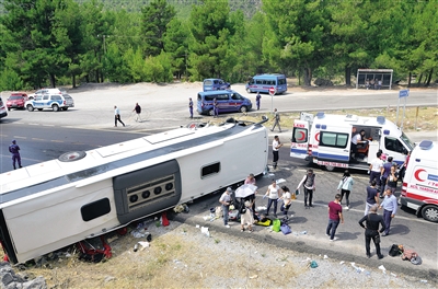 据报道,当地时间29日10时左右,一辆载有中国游客的大巴在土耳其南部安塔利亚省发生车祸,造成车上包括31名中国游客在内的33人不同程度受伤。 新华社发