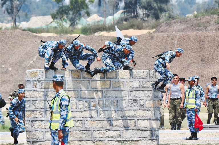泉州石狮将军山脚下,来自中国、俄罗斯、伊朗、委内瑞拉、苏丹5国的海上精英30日展开了海上登陆赛第一阶段障碍赛的激烈角逐。中国代表队3个陆战班以7分51秒、7分58秒、8分35秒,包揽障碍赛前3名。新华社发