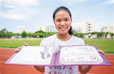 8月1日下午,记者在三亚市第一中学的田径场上见到了林进霞,因为今年以55秒88的400米田径成绩考入清华大学,她已经被三亚地方媒体报道了许多次,在当地小有名气。但记者要约她采访还是很困难,总要到田径场才能“逮”到她——她正和队友们忙着备战即将到来的海南省第五届运动会。