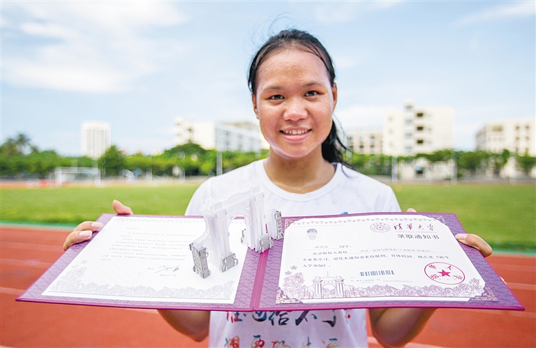 作为跳远体育特长生进入三亚市第一中学,但林进霞在跳远项目上并没有走太远。刚入校没多久,她就因为跳远项目高强度训练受伤,患上了骨膜炎,近半年的时间无法正常训练。“那段时间觉得特别难过,妈妈也觉得我太辛苦劝我退出,但我想着努力撑一撑总能过去吧。”就这样,这个倔强的姑娘坚持了下来。