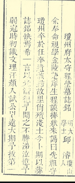 丘濬听后悲不自胜,想起自己考取秀才后,增补为琼州府学的生员,知府程莹激赏他少有才名,对他寄予厚望,悉心教诲。五年后,即1444年,丘濬秋闱高中,考取广东省第一名——解元。程莹素爱奖掖后学,知道他家贫,便在经济上给了不少资助。丘濬感叹,没有程公的砥砺与支持就没有我的今天啊!一篇铭文我怎可推辞呢?这篇文章就是收录在光绪《罗田县志·艺文志》中的《琼州府太守程莹墓志铭》。