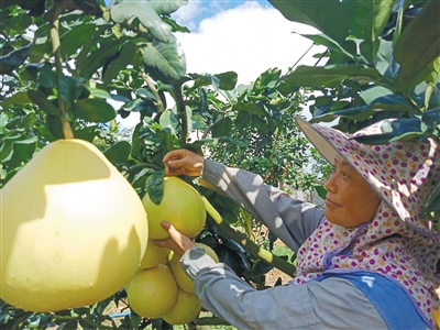 走进一片三红蜜柚林,齐人高的柚树上挂满了拳头大的蜜柚。“三红蜜柚具有果皮、果肉、果囊‘三红’的特征,此品种甜度高、果香浓、个头大。”南金农场公司副总经理张维亮告诉记者,南金农场公司光热条件绝佳,非常适合蜜柚生长,且蜜柚成熟时间比内地早1个月左右,可成功避开上市高峰期,从而在市场和价格方面占尽天时。