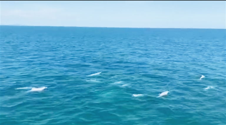 视频中,先是两三头白海豚浮现,白色的身影在碧蓝的大海中十分抢眼。很快,海水之下又跃出七八头白海豚,争相聚拢一处。紧接着,远处还有多头白海豚以及数头黑白相间的海豚在向前疾游。