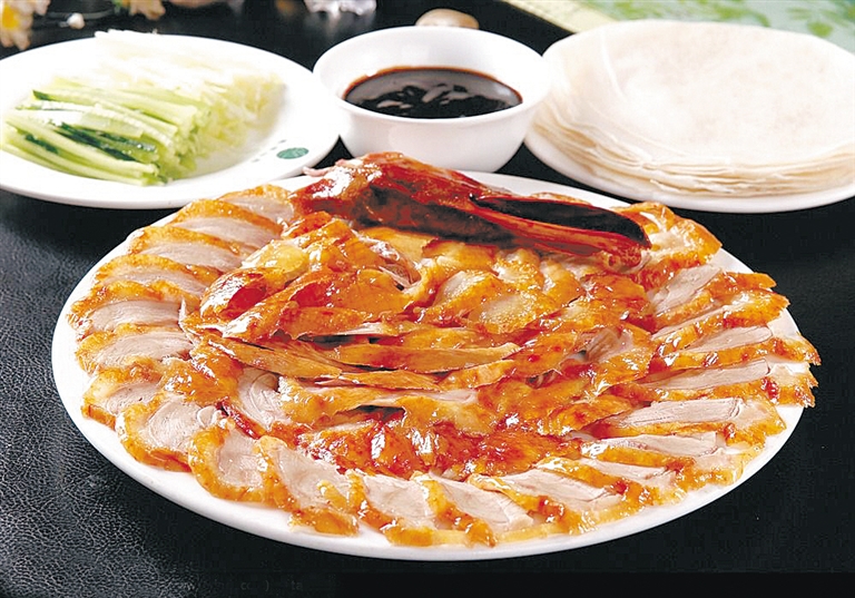 当然,名声在外的北京美食当属北京烤鸭,鸭肉通过果木炭火烤制,色泽红润,肉质肥而不腻,外脆里嫩。烤鸭烤制成后,将其肉片片均匀切下,用荷叶饼将肉包裹其中,抹上甜面酱,再放葱段、黄瓜条等,将美食一同入口,口感浓郁丰富,令人回味无穷。