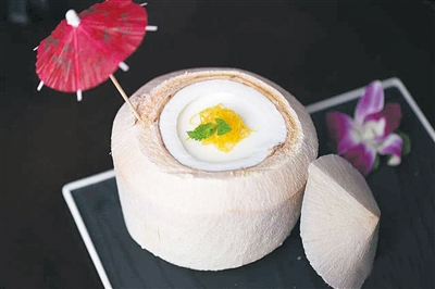 和凉粉类似的冰凉小吃还有椰子冻。像椰子这样清新又甜美的食物,自带着热带海岛风,被做成椰子冻后就成了解暑小吃里的“明星”产品。整颗的椰子冻散发着冰凉的气息,从开口处打开,奶白色的椰子冻散发着椰子的清香,它冰凉丝滑的口感更是让人无法抵抗。如果觉得吃椰子冻单调,还可以在里面加上水果、炖熟的燕窝等,高颜值、高营养的水果椰子冻、燕窝椰子冻也就DIY成功了。